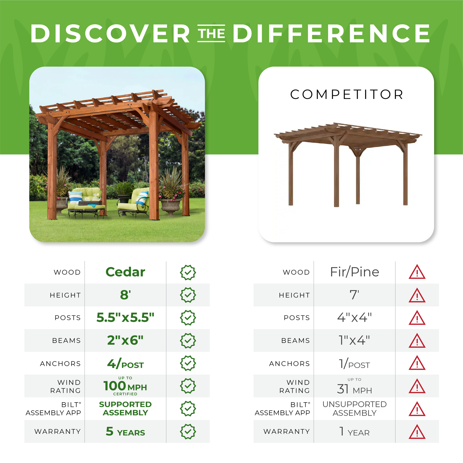 Our sturdy 10×10 pergola is a marvel of solid construction and timeless beauty. Every inch has been meticulously crafted from 100% cedar, guaranteeing you an edifice of enduring strength and elegance.