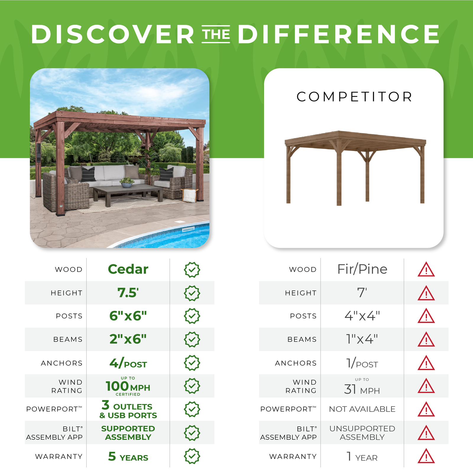 But this pergola isn’t just stylish – it’s also strong. Because it’s PRO-TECT™ Tested and Proven to withstand winds as high as 100 mph*, you can enjoy the generous space and exclusive PowerPort™ to let the good times roll, trusting that your pergola never will.
