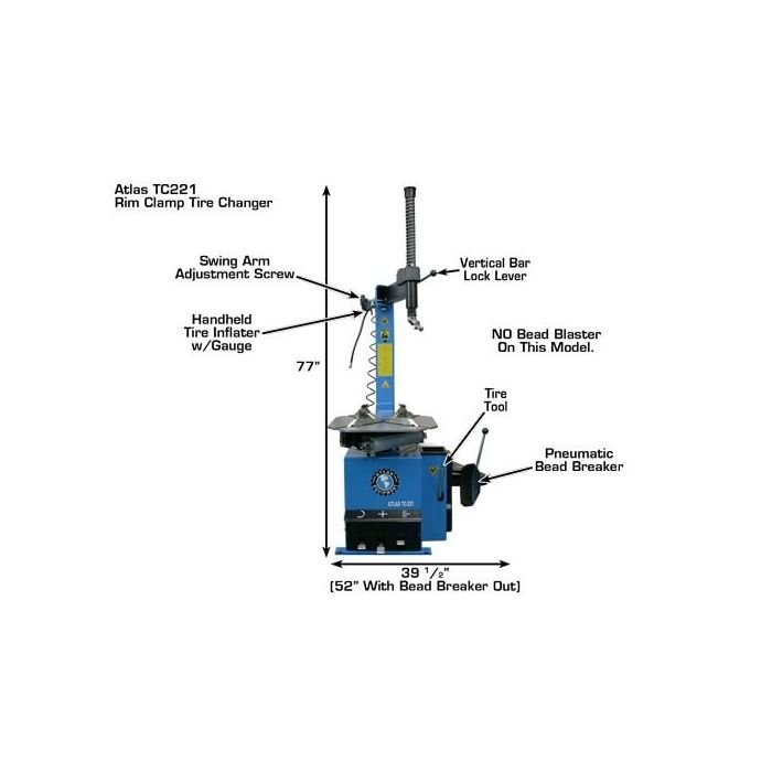 The Atlas TC221 wheel clamp swing arm tire changer is the perfect changer for a small commercial garage or an ATV/motorcycle dealer.