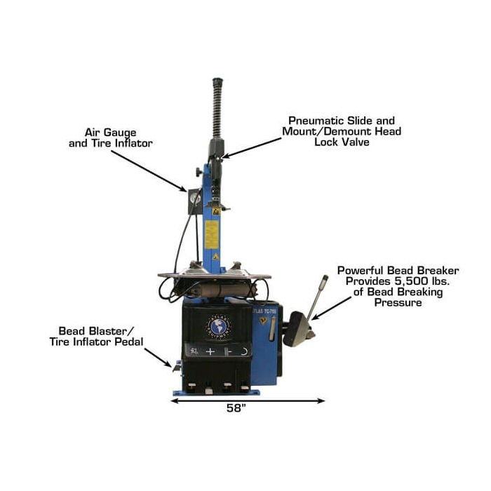 The turntable jaws (which can be covered with the standard protective plastic inserts) hold the rim securely without damaging the surface of the rim. The Atlas TC755 comes standard with an inflator hose and gauge and powerful built-in Bead Blaster to seat the beads on the most stubborn tires.