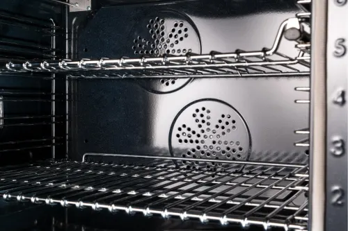 - Two large-blade fans positioned on the diagonal axis and subsidiary air vents at the top and bottom of the oven cavity provide balanced airflow and even heat distribution.