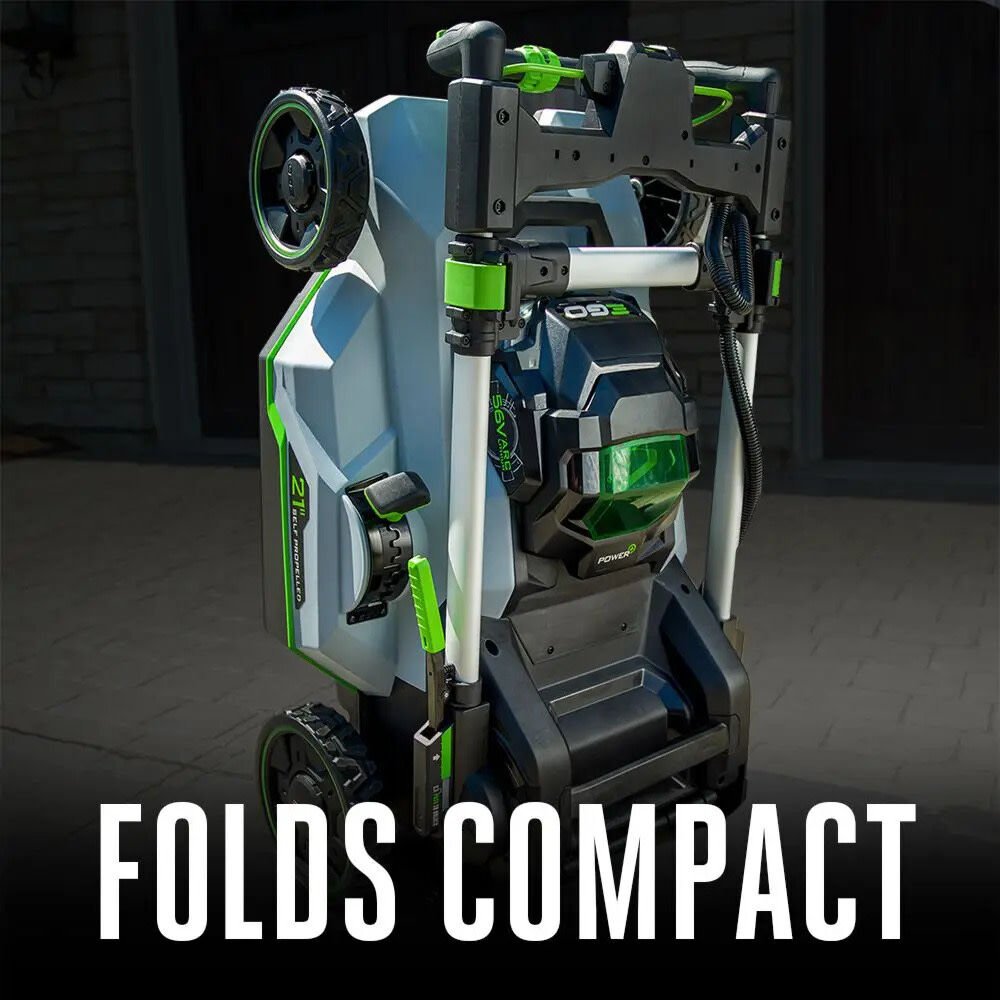 The EGO POWER+ 21″ Select Cut Self-Propelled Mower delivers performance that exceeds the power of gas. The Select Cut™ Multi-Blade Cutting System is equipped with three interchangeable lower blades: the Mulching Blade, High Lift Bagging Blade, and Extended Runtime Blade. The Mulching Blade comes installed on the lawn mower and is ideal for weekly mulching, giving you the mulching quality expected from a high-end gas lawn mower. The High Lift Bagging Blade provides extra suction ideal for bagging, leaving your yard free of clippings. The Extended Runtime Blade provides an optimal balance of cut quality and runtime for all around performance. All three blades can be used interchangeably based on your desired cut. The Upper Blade is used in combination with the lower blade chosen to slice the grass into fine fragments, greatly enhancing cutting performance with all grass types. EGO Touch Drive™ self-propelled technology puts complete control of the self-propel system in the palm of your hands by using pressure to engage the system. Easily control the variable speed with a dial positioned at your fingertips for safe and convenient operation. The Select Cut™ cordless lawn mower harnesses the power of the industry’s most advanced 56V ARC Lithium™ batteries to deliver up to 60 minutes of runtime on a single charge with the recommended 7.5Ah battery. Three-in-one functionality delivers your choice of mulching, side discharge, or bagging your grass clippings; an easy-access two-bushel grass collection bag is included. This electric lawn mower includes bright LED lights for added visibility when mowing at dawn or dusk, and it folds for compact storage between cuts. Experience Power Beyond Belief™ with the EGO POWER+ 21″ Select Cut™ Self-Propelled Lawn Mower.