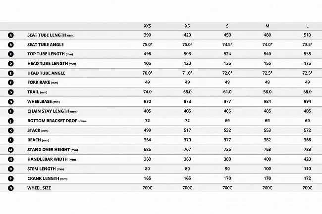 - Crankset: Shimano 105, 36/52; XXS: 165mm, XS: 165mm, S: 170mm, M: 170mm, L: 172.5mm