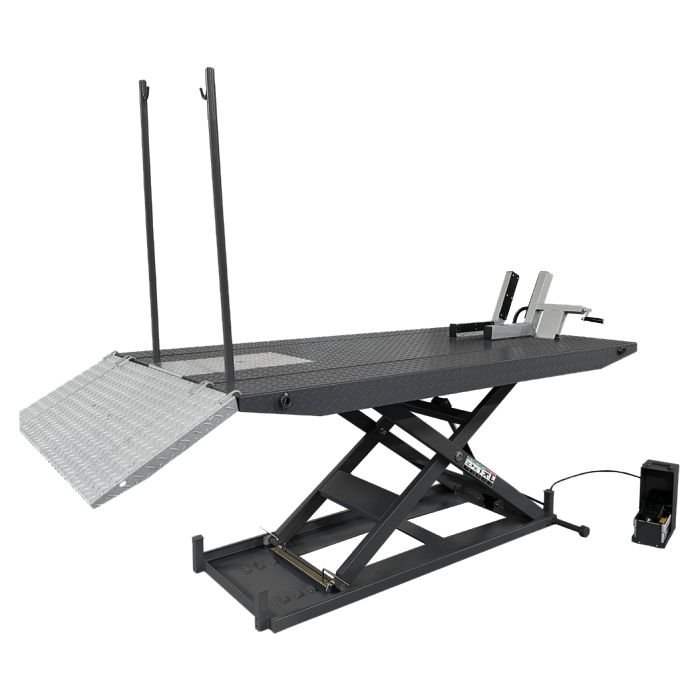 The M-1500C-HR also features heavy duty diamond plate platform, stabilizer bar, updated dual side manual lock release, rear drop out panel, while also including a motorcycle vise and rear service support poles. Designed for multi-use applications, the M-1500C-HR can be the perfect service lift solution for power sport service and repair shops, power sport dealers and residential garages.