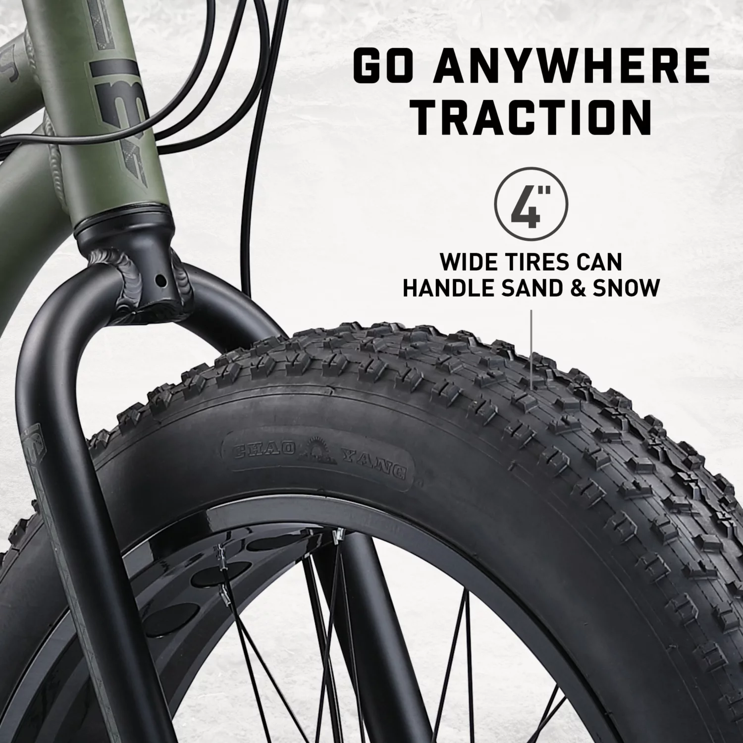 • 26-inch wheels come with oversized 4-inch-wide tires for the added traction and control you need to take on the toughest trails