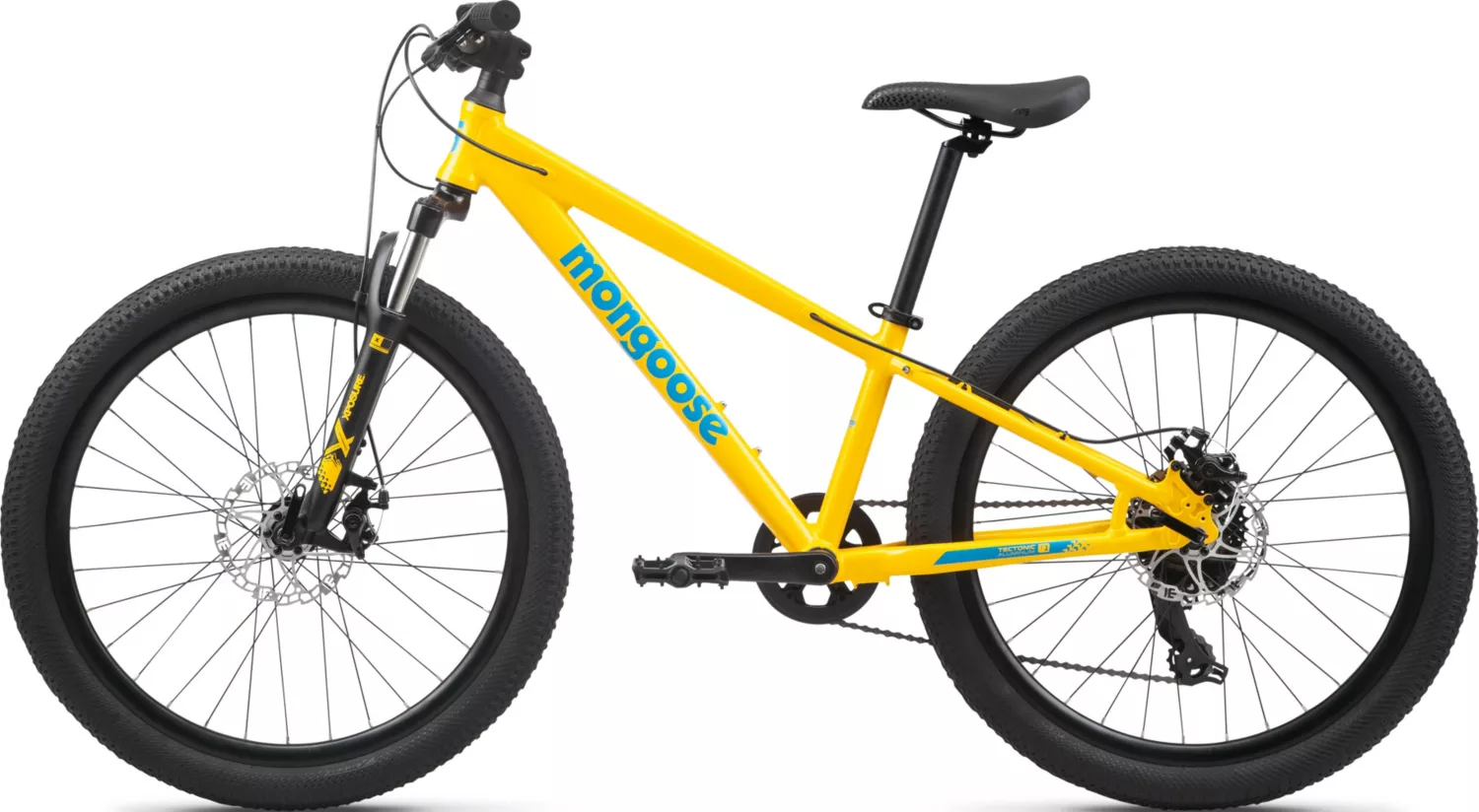 Ideal for adventurous youths, this Mongoose Kids’ 24” Switchback Sport Mountain Bike features a durable Tectonic T1 aluminum frame with modern trail geometry and internal cable routing. Equipped with a 50mm travel suspension fork, it smooths out rough trails, while the Microshift 1 x 7 drivetrain ensures efficient pedaling and shifting. With reliable mechanical disc brakes and aluminum rims that easily handle dirt paths, this bike is perfect for both on and off-road exploration.