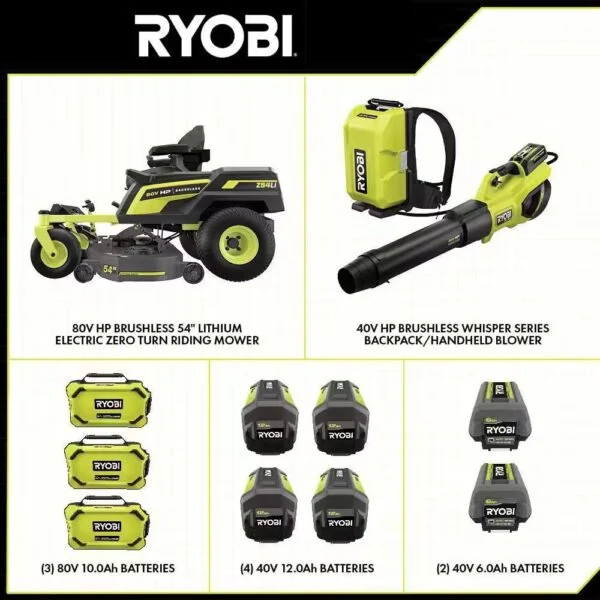 - Included: 80V HP 54 in. Zero Turn Mower, 40V HP Backpack Battery, 40V HP Blower, (3) 80V Batteries, (4) 40V 12 Ah Batteries, (2) 40V 6 Ah Batteries, 80V Super Charger