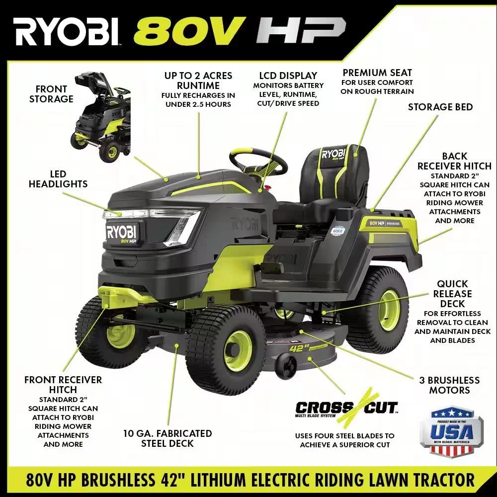 Introducing RYOBI’s first lithium-ion battery powered Riding Lawn Tractor, the RYOBI 80V HP 42″ Lithium Electric Riding Lawn Tractor. 80V HP Technology combines brushless motors, advanced electronics, and lithium-ion batteries to deliver the power equivalent to a 21 horsepower gas engine*, delivering all the power, without gas, engine maintenance, and significantly less noise. This tractor is powered by 3 brushless motors and 3 80V 10Ah batteries to cut up to 2 acres per charge. When the job is done, the tractor fully recharges in less than 2.5 hours with the included Hyper Charger and on-board charging port. The most versatile Riding Lawn Tractor in the industry features front and rear storage compartments to haul mulch, logs, plants, or any material around the yard. Make quick work of towing, with a capacity of 500 lbs. and a universal 2″ square hitch in the front and rear of the Tractor. The Tractor is equipped with a 10-gauge heavy-duty fabricated steel deck and the CROSS CUT multi-blade system that uses 4 steel blades to achieve a superior cut. Remove the deck in under 90 seconds for quick blade maintenance. The full color back lit LCD screen displays runtime, battery level, and charge status while the RYOBI Riding Mower app allows you monitor your charge status from your phone. This Tractor is proudly made in the USA with globally sourced materials and has a 5-year limited warranty with exceptional service, bringing repairs to you or one of the 300+ service centers**.