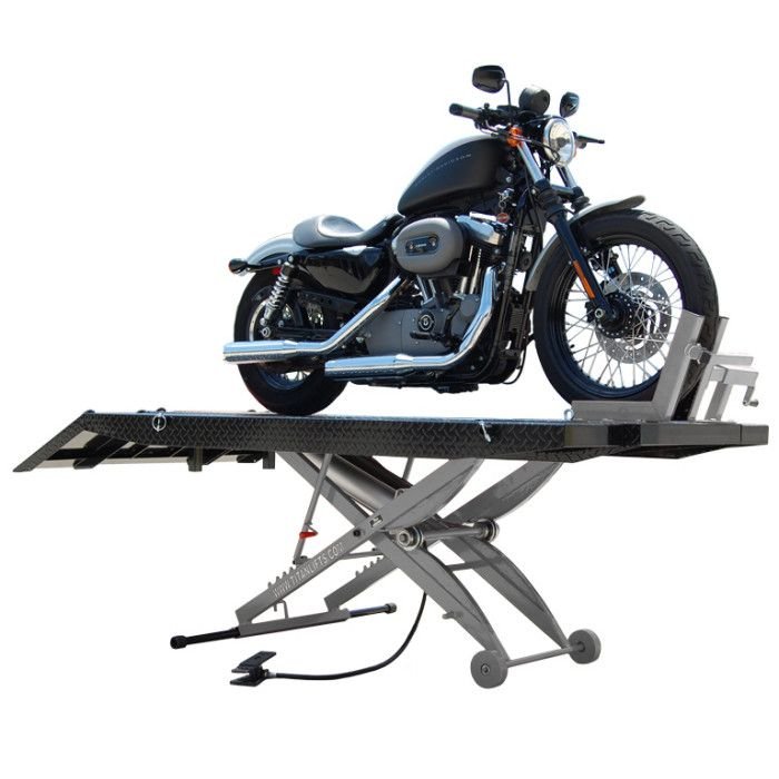 Are you looking for an affordable motorcycle / ATV and other equipment lift platform that will hold up over time? We’ve seen so many of these products out there over the 20 years we’ve been in business that just won’t hold up to daily use. Well this one won’t disappoint you. Titan is known throughout the industry for their quality, and this lift table is the perfect example. Plus, it includes all the popular accessories that typically cost extra. Comes complete with side extensions, front extension, wheel vise, removable extended approach ramp, drop out panel for the rear wheel, and it’s totally portable. Just hook up shop air, and you’re ready to roll! So check out the specifications below and give us a call with any questions.