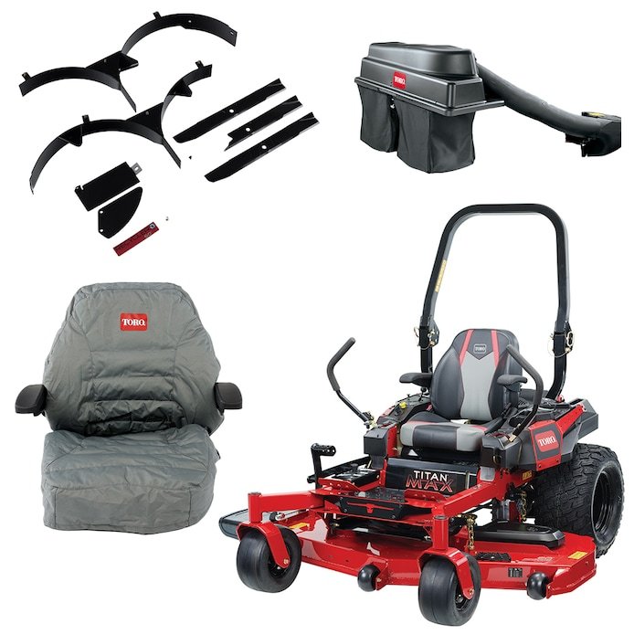 Elevate your outdoor experience with the Titan MAX 60-inch 26-HP V-twin Gas Zero-turn Riding Lawn Mower. A century of relentless innovation and unwavering toughness packed into one badass machine. Seize the throne of your domain with Titan MAX’s industry-leading ride comfort, seamless on/off access, and more. Toro genuine high back seat covers ensure your seat withstands the daily grind, made from waterproof nylon/polyester fabric for ultimate protection. For unmatched reliability, trust Toro genuine replacement parts designed to precise engineering specifications. Take control of grass clippings and fallen leaves effortlessly with the Toro TITAN MAX E-Z Vac Twin Bagger, featuring a 6-bushel capacity. Embrace the power, durability and convenience. Pair it with the mulching kit that comes with mulch blades, mulch baffles, hardware and instructions.