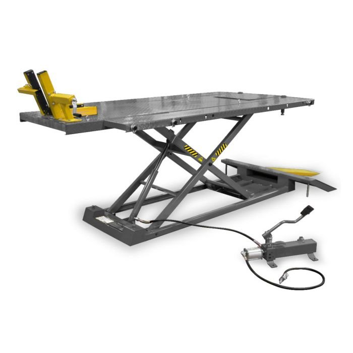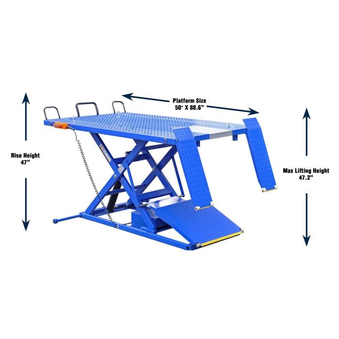 The U-2200IEH-XR is a 2,200 lbs. lifting capacity UTV / Motorcycle Lift Table is capable of lifting the heaviest UTVs on the market today. The integrated 110V electric hydraulic power unit is operated using a hand held pendant that also disengages your safety locks for safe and easy operation. The 65″ wide table, including the easily removed UTV side extensions, allows you to lift the widest UTVs for service. The ability to raise the lift to 47″ allows even the tallest technician to work comfortably. Wheel Chock and Vise Sold Separately.