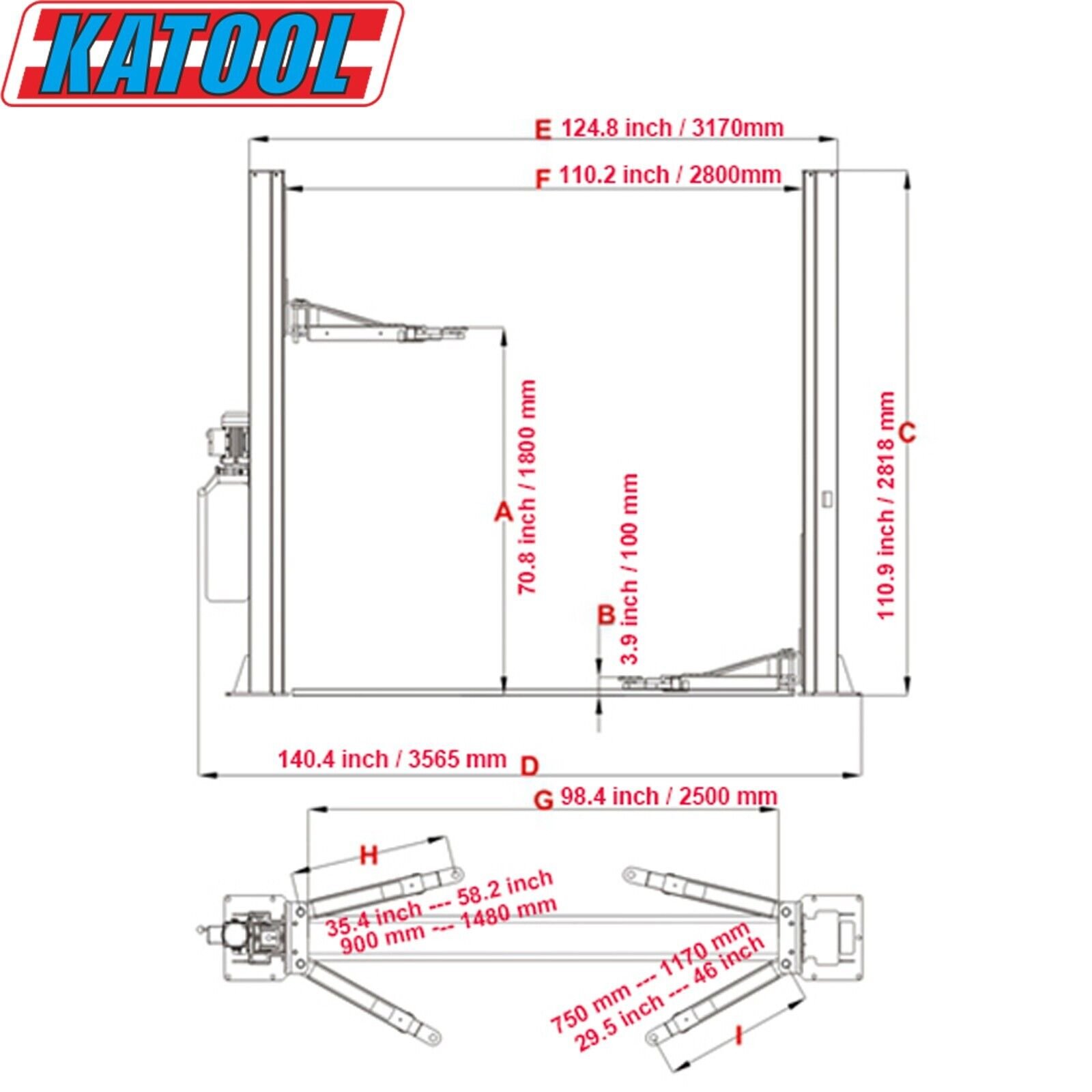 *Concrete thickness must be at least 5.9” (150 MM) with a 3000 PSI rating. Failure to install this lift on the proper concrete could result in serious injury or death! It is the customer’s responsibility to verify concrete thickness and strength before purchase and installation. Lifting Capacity 10000lbs.(4500KG) Max. Lifting Height 70.8″/1800mm Min. Height…